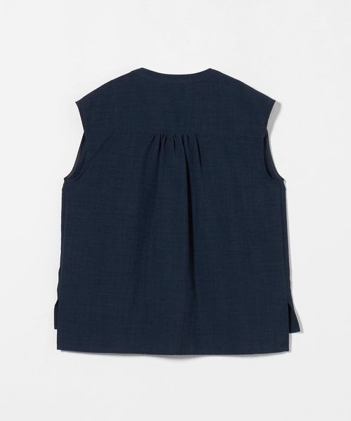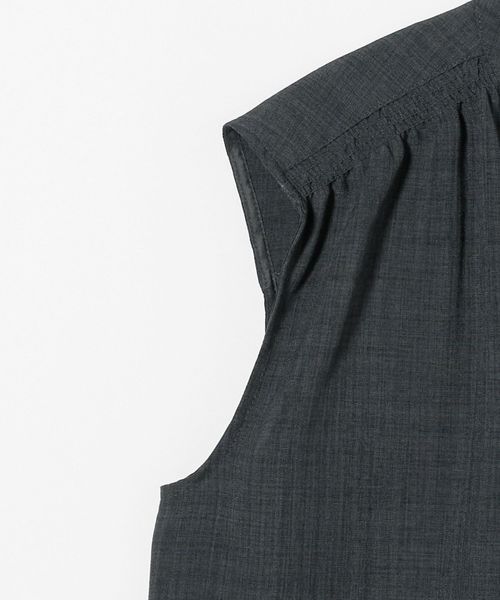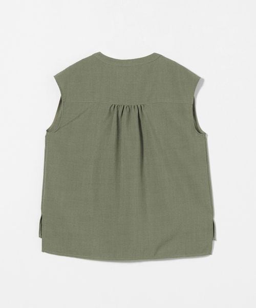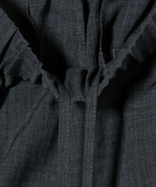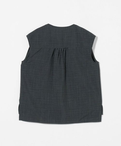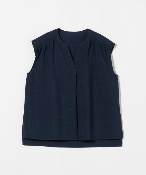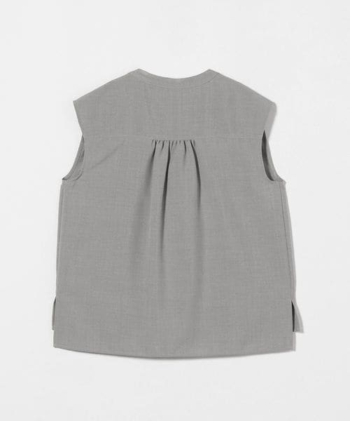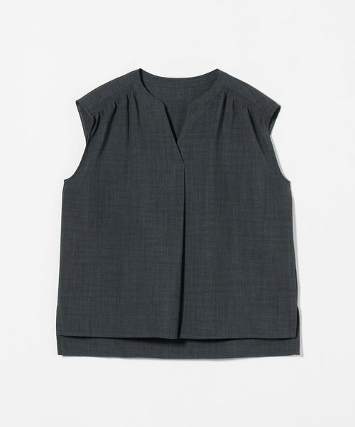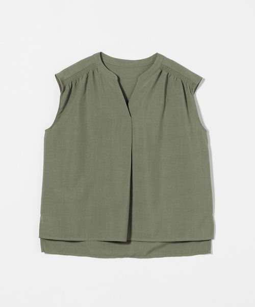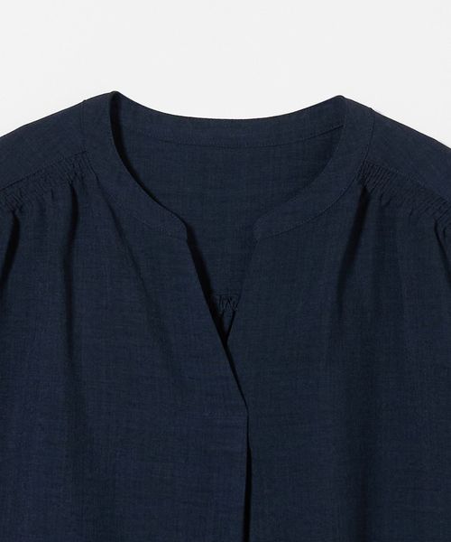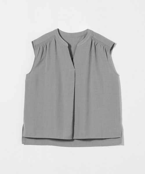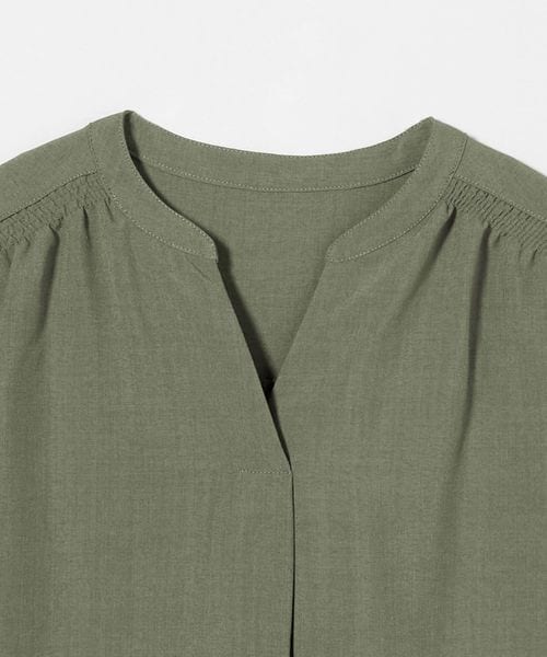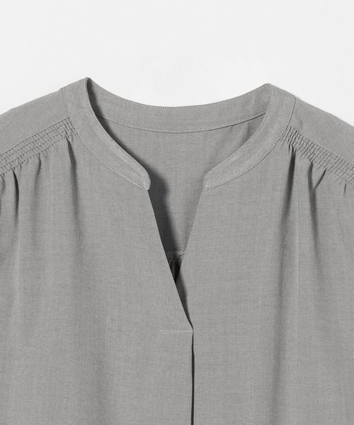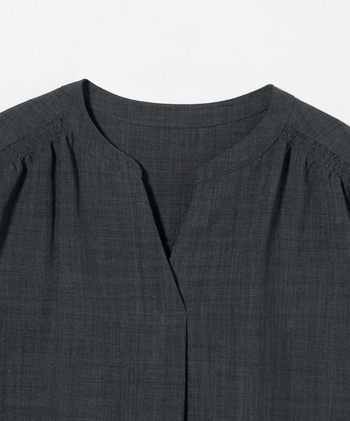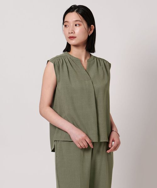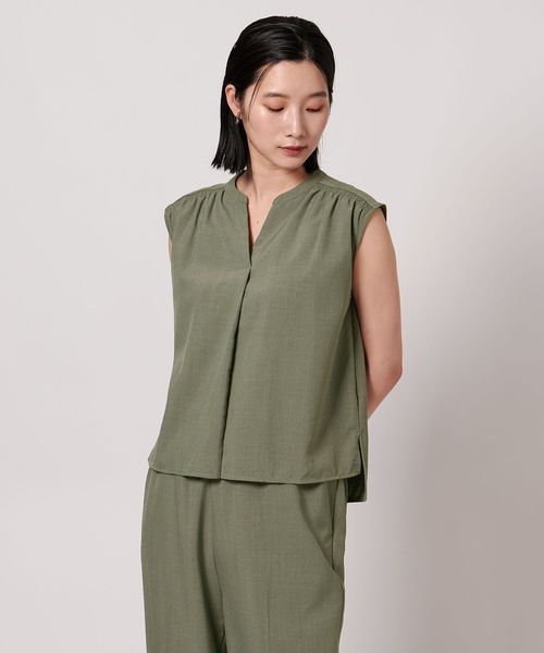 ブラウスは首元をすっきりと見せてくれるキーネックと女性らしいギャザー切替がポイント。
