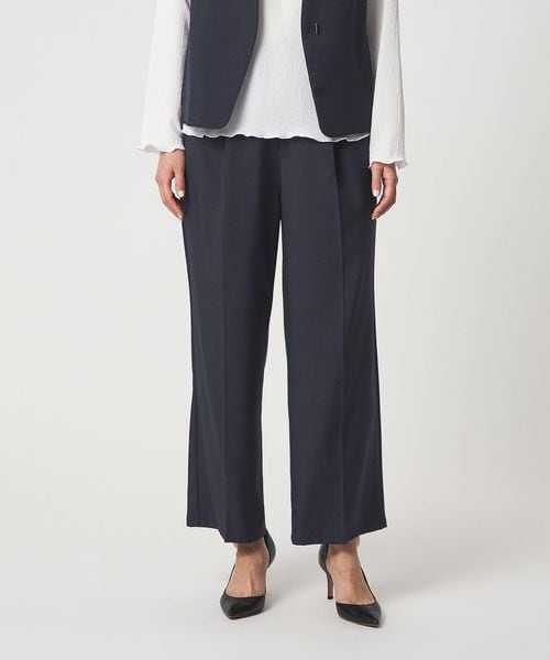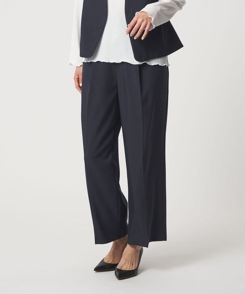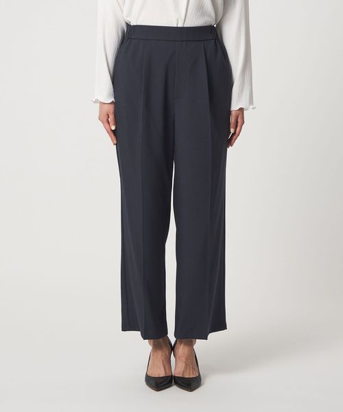 パンツは広がりすぎないタックワイドシルエットで、きちんと感と動きやすさを両立。