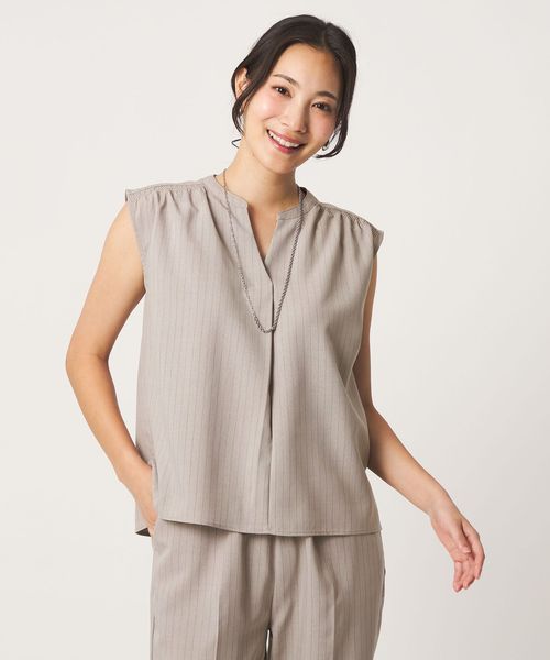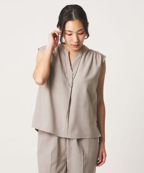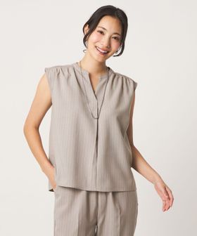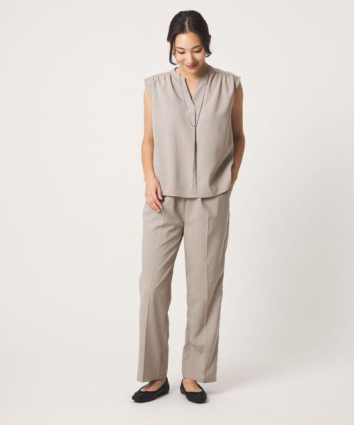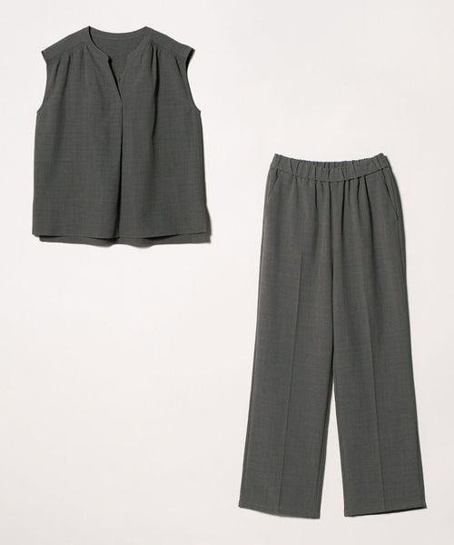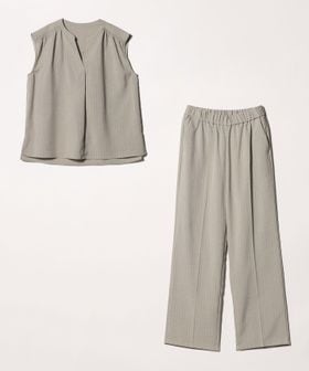 ノースリーブのブラウスとワイドパンツのセットアップ。