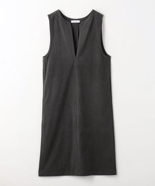 すっきりとしたIラインシルエットと、深めのキーネックがポイントのジャンパースカート。