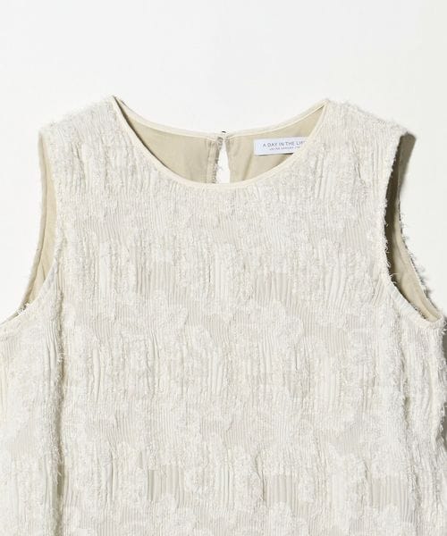 ジャガードと細かなプリーツが目を惹くノースリーブワンピース。