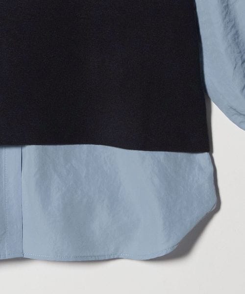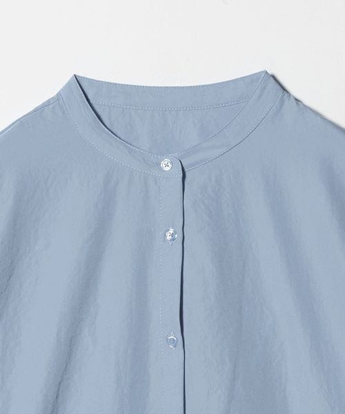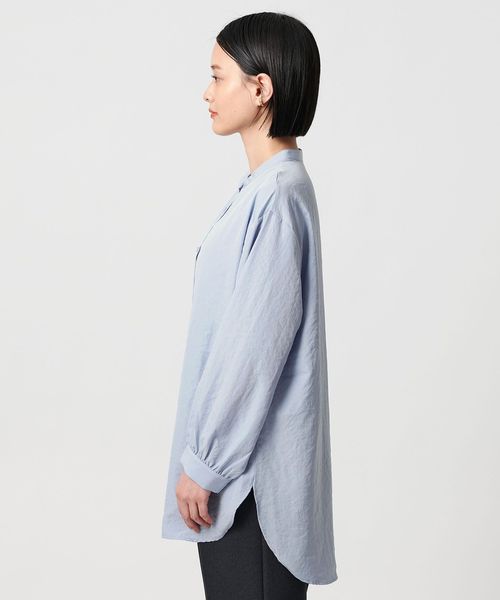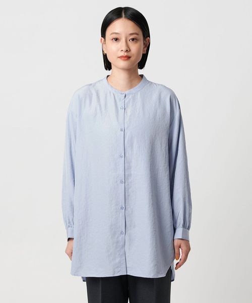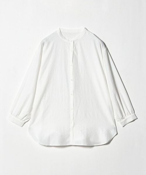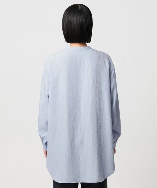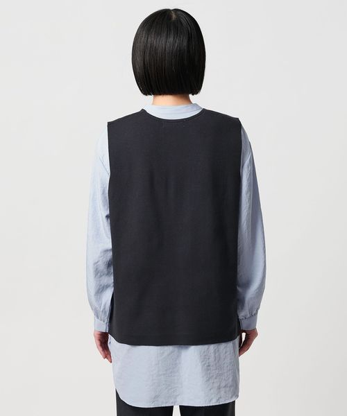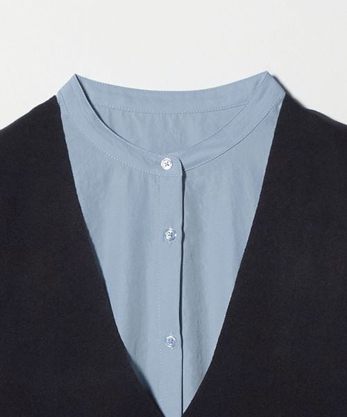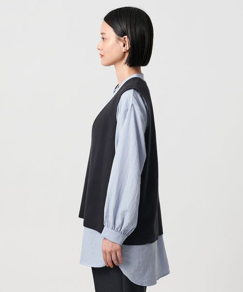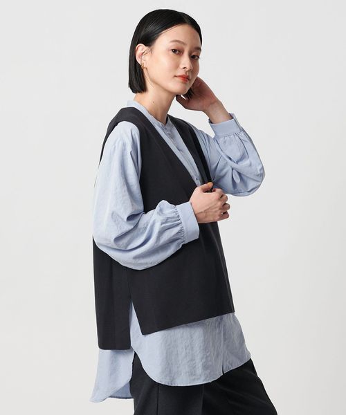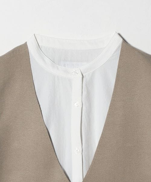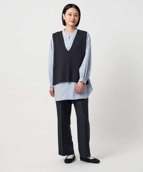 深いVネックのニットベストとほどよく透け感あるオーバーサイズのバンドカラーシャツで、こなれ感あるレイヤードスタイルが完成します。