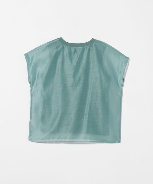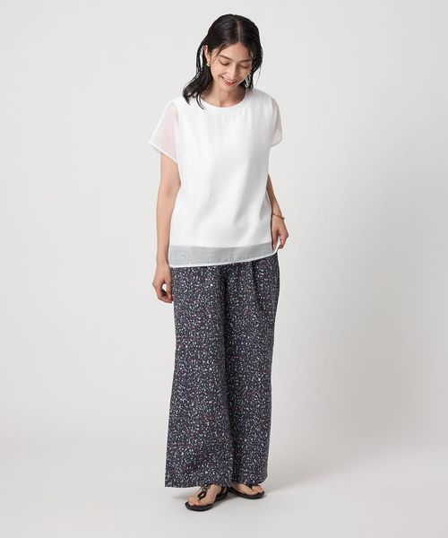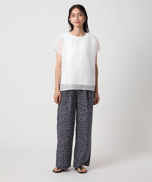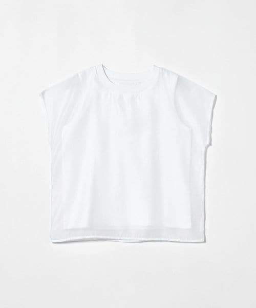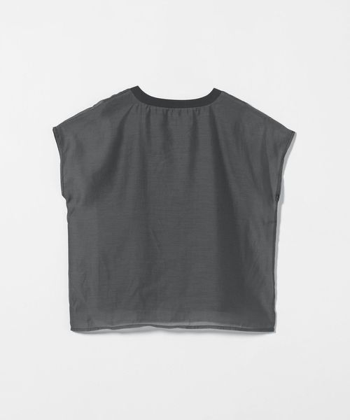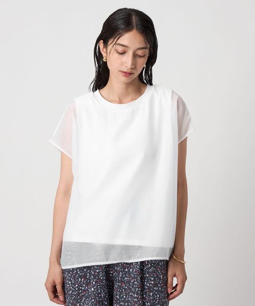 ノースリーブのカットソーの上にオーガンジーをレイヤード。