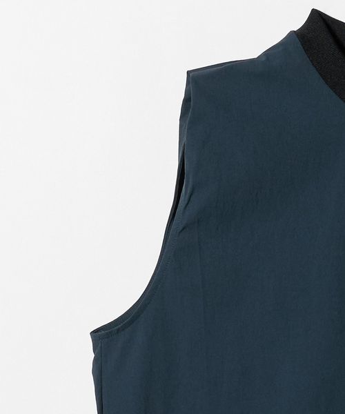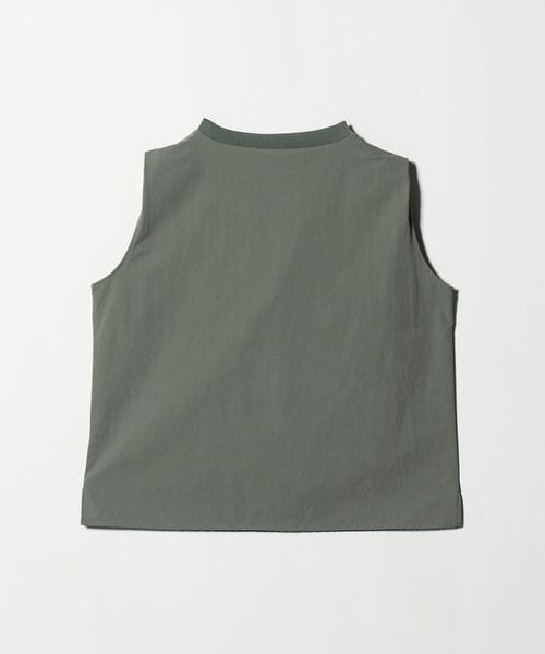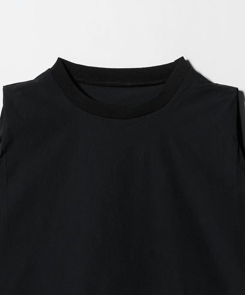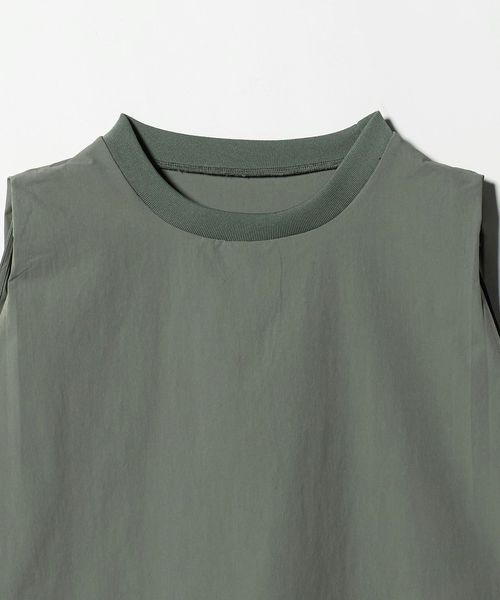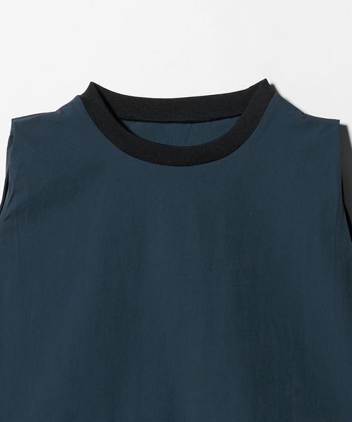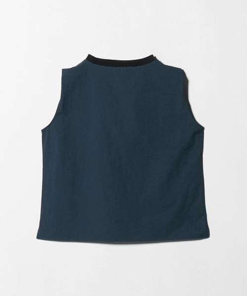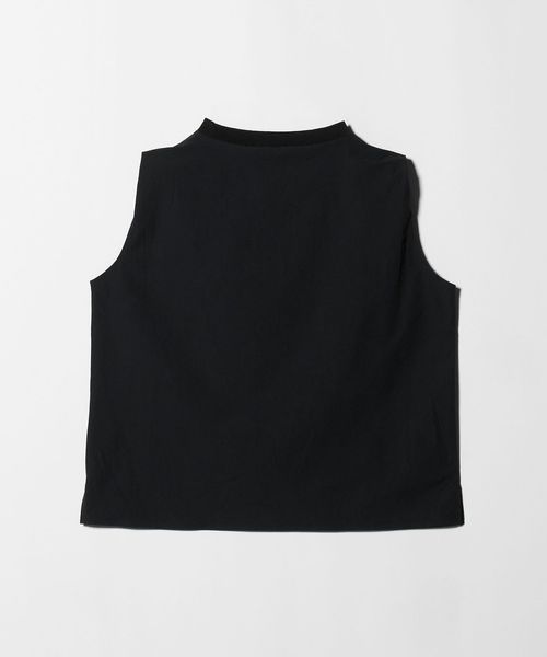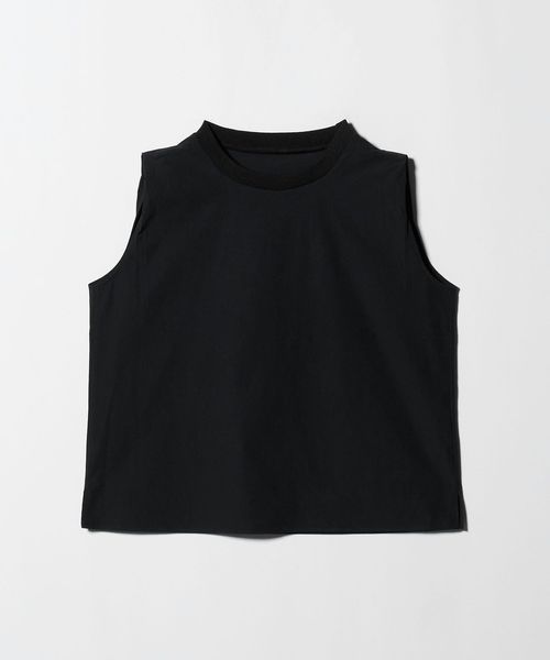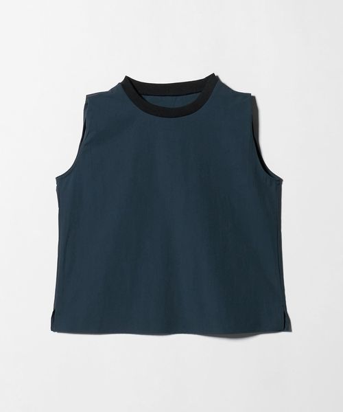 トップスは襟の切り替えがポイントのシンプルなノースリーブのプルオーバー。