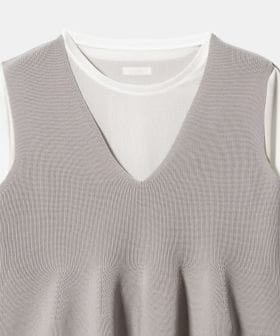ペプラムシルエットのニットベストに今年らしいシアー素材のインナーをセットしました。