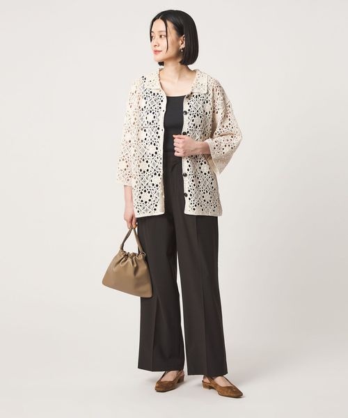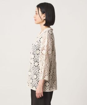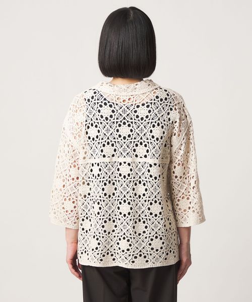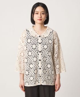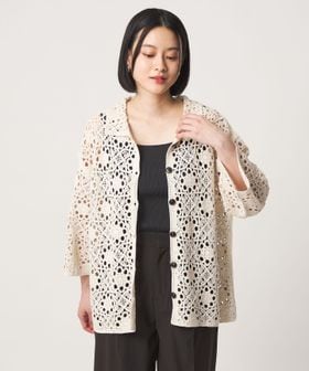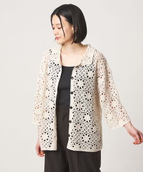 クロシェ編みのニットカーディガン。