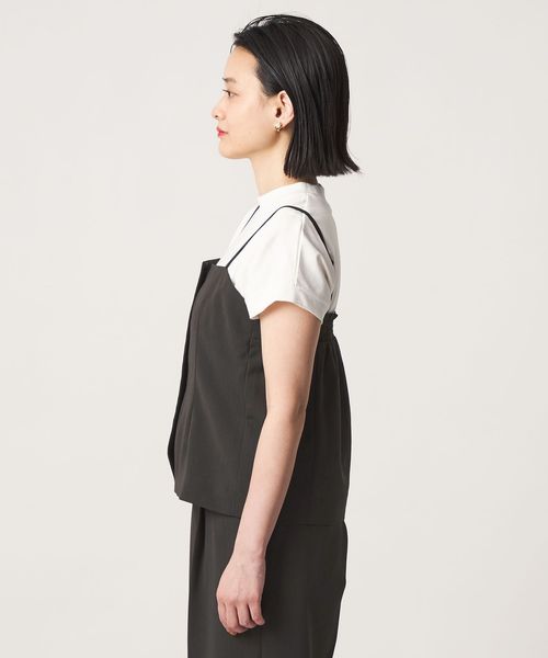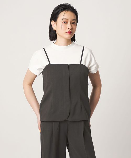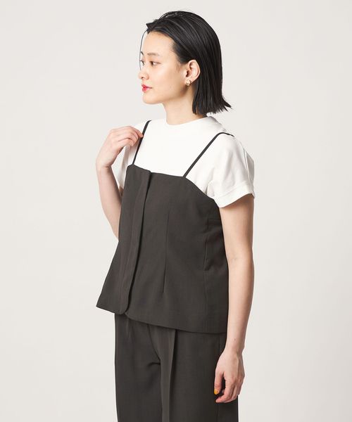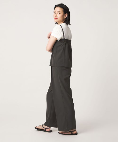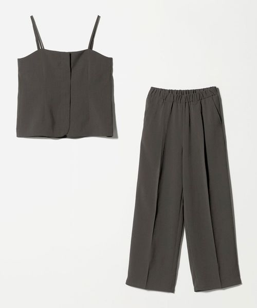マニッシュなデザインのジップ付きキャミソールと、ワイドパンツのセットアップ。