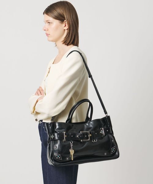 フロントに施したベルトデザインとキーアクセサリーがポイントで、付属のリングにはチャームやキーリングを取り付けるなど、自分好みにカスタマイズも楽しめます。