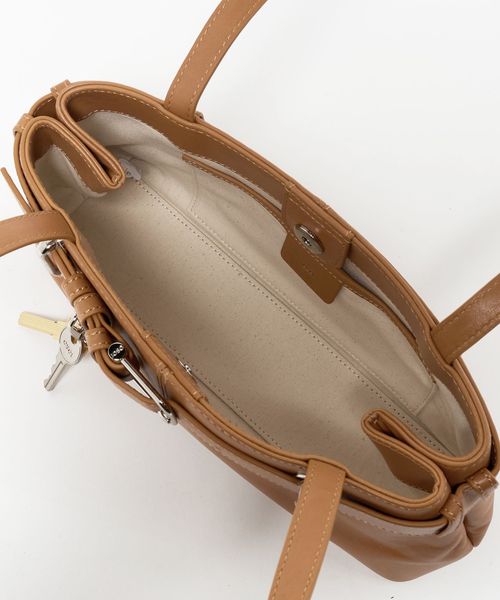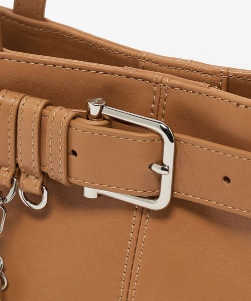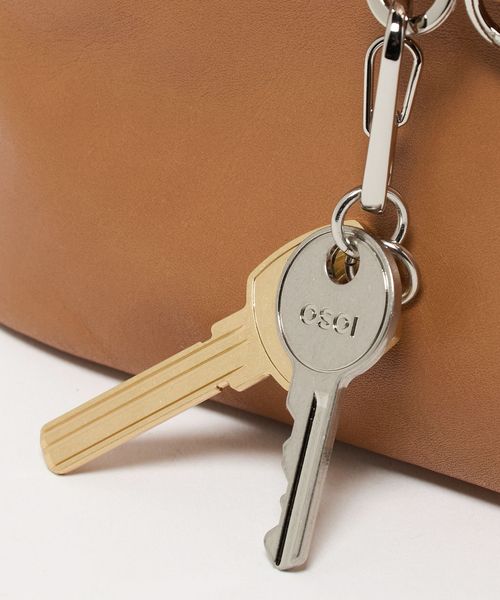 フロントのベルトディテールとキーチャームがアクセントで、付属リングでチャームの追加も可能。