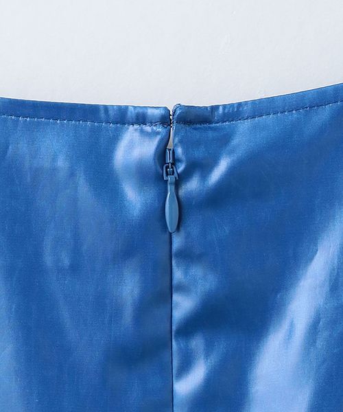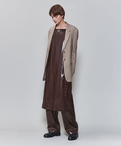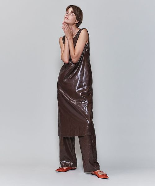 ビニールのような質感と艶感のある独特な生地を使用したノースリーブワンピース。