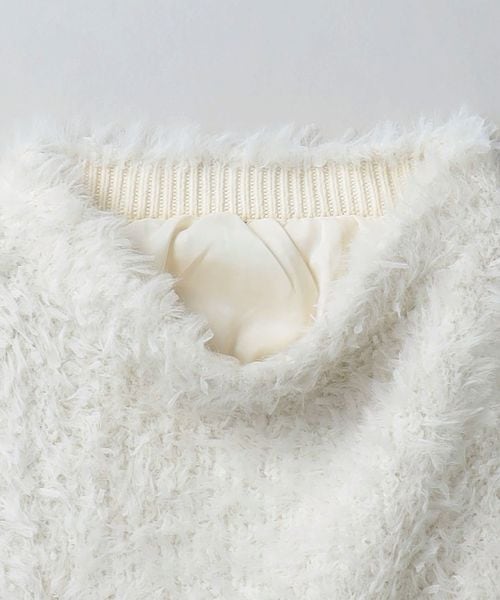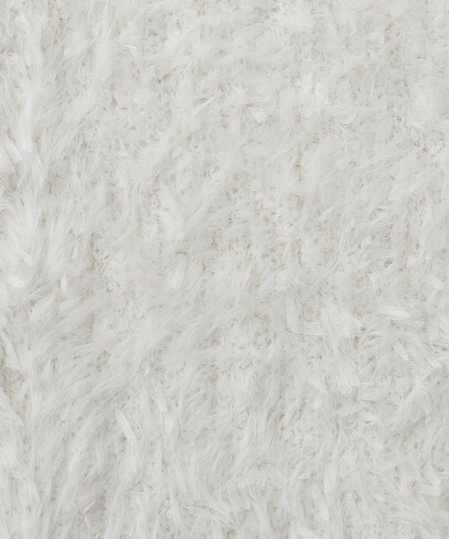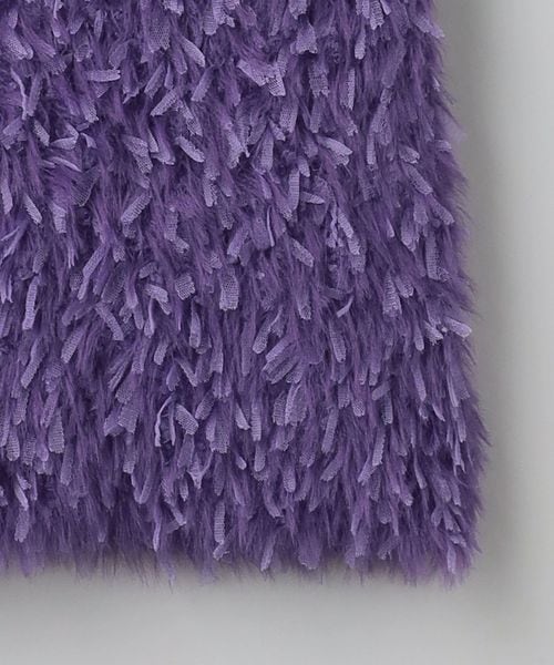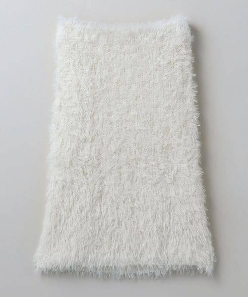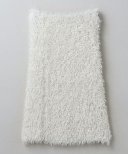 チュールが撚糸された意匠糸とナイロンフェザーの糸で編み立てたふわふわの表面感が特徴のニットスカート。