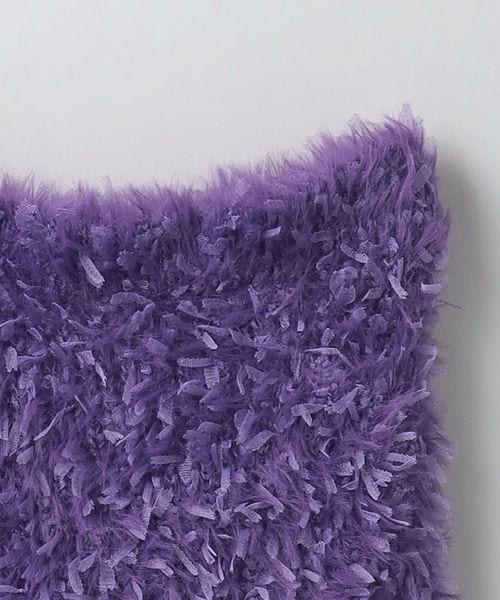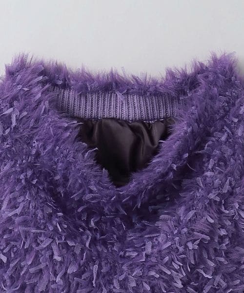温もり感があるファンシーな風合いも、モードな印象のオフホワイトとパープルの色味やタイトなシルエットで大人らしい艶感のある着こなしに。