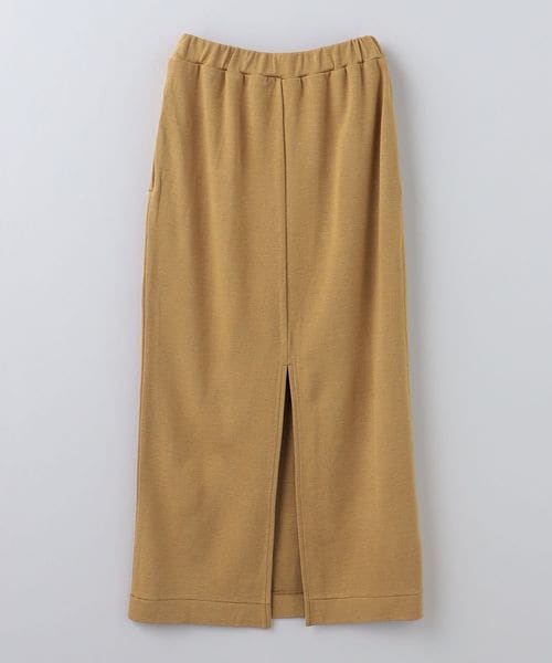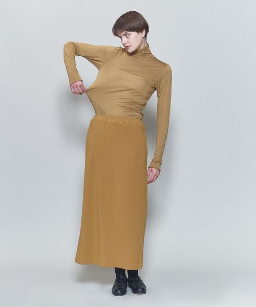 微光沢なレーヨン混の生地を使用したタイトめシルエットのロングスカート。