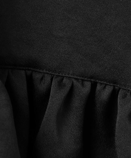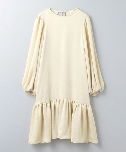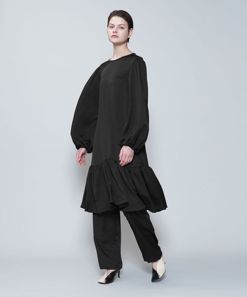 裾のギャザー切り替えが特徴の艶感のある生地で仕立てたワンピース。