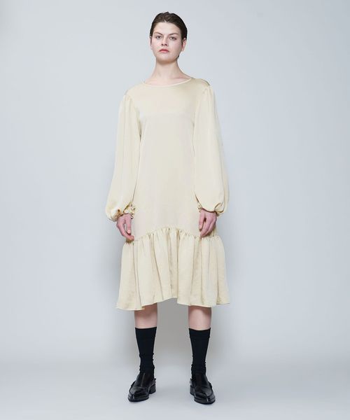 裾のギャザー切り替えが特徴の艶感のある生地で仕立てたワンピース。