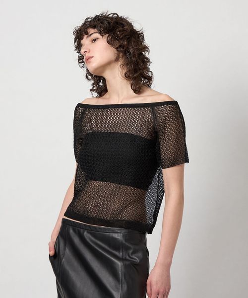 凹凸のある糸を使用した透かし編みのオフショルダーニット。