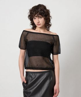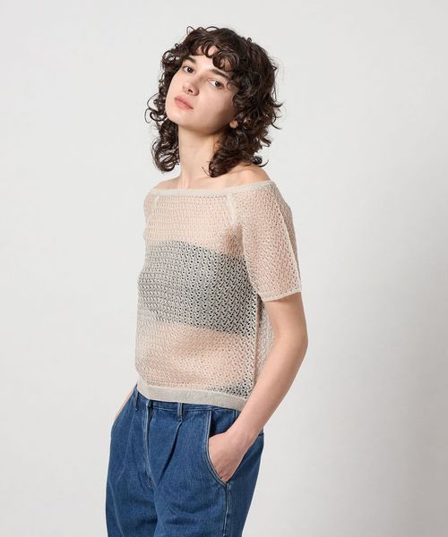 凹凸のある糸を使用した透かし編みのオフショルダーニット。