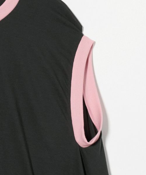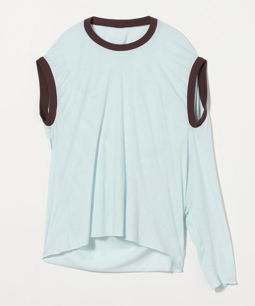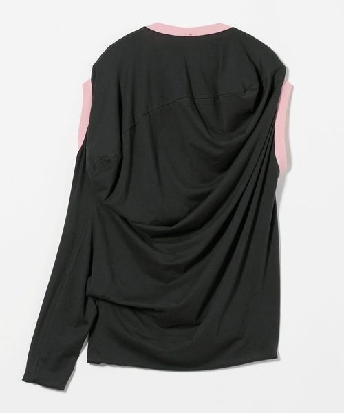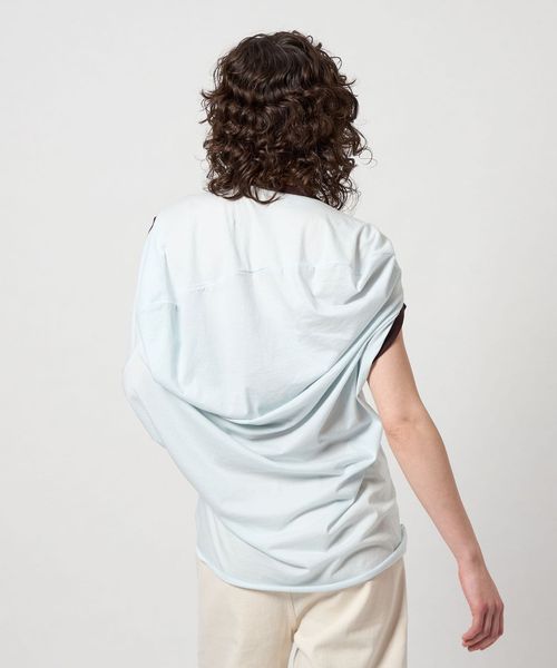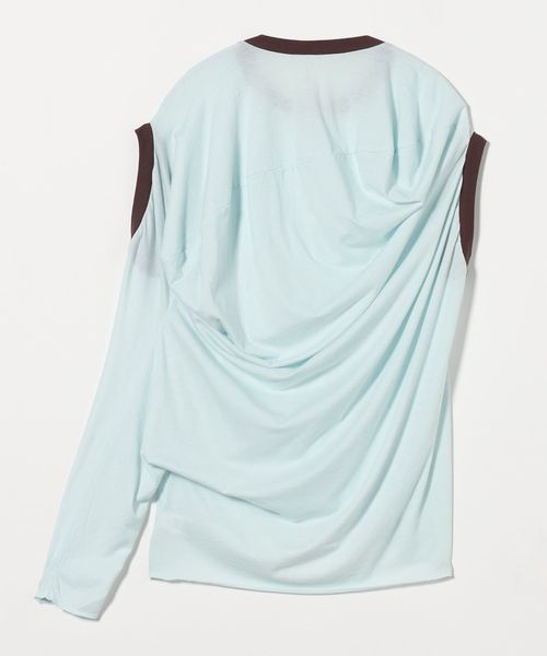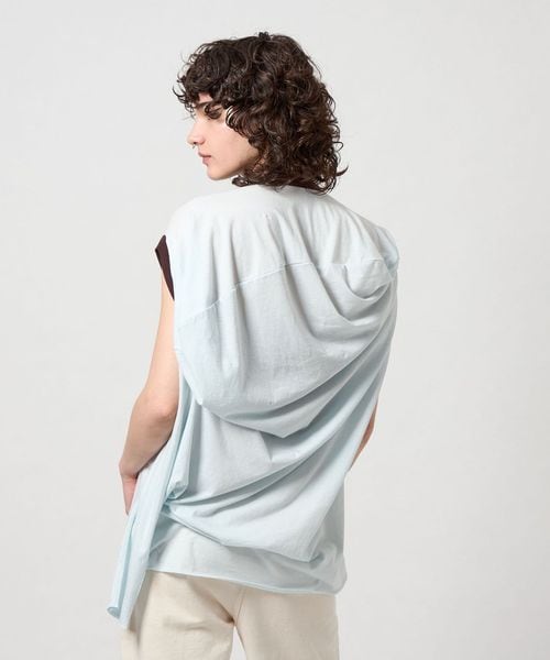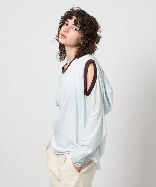 両腕ノースリーブの着用と、左腕のみ袖に通した着こなしのアレンジをお楽しみいただけます。