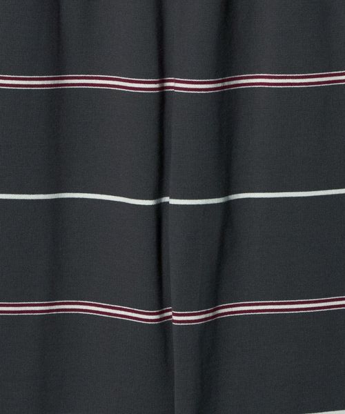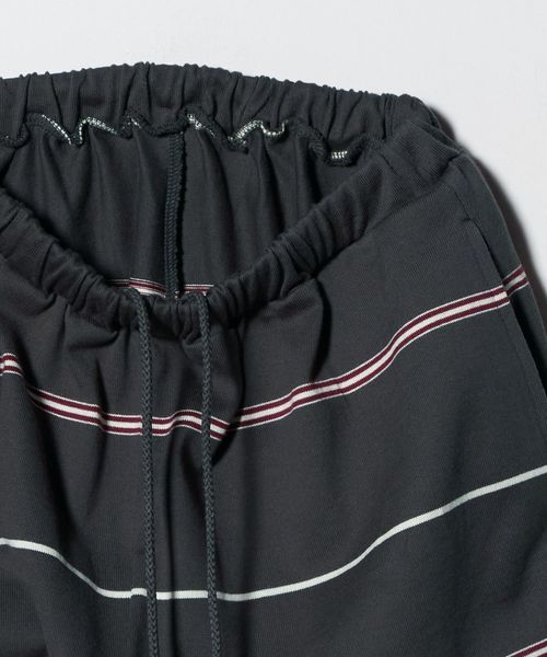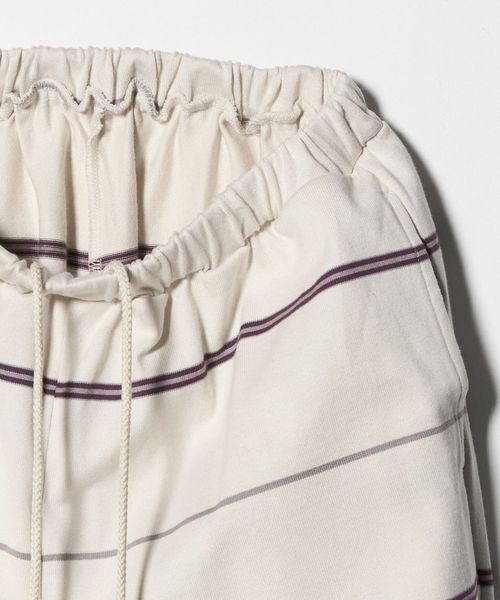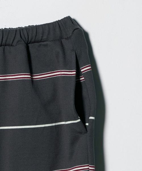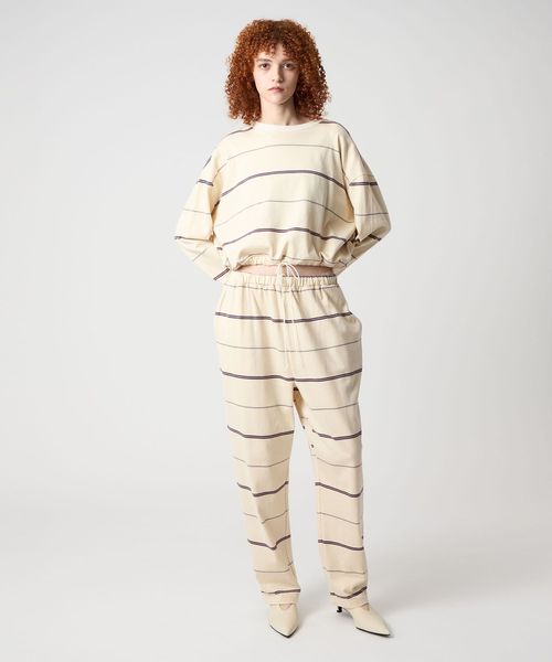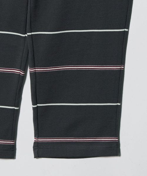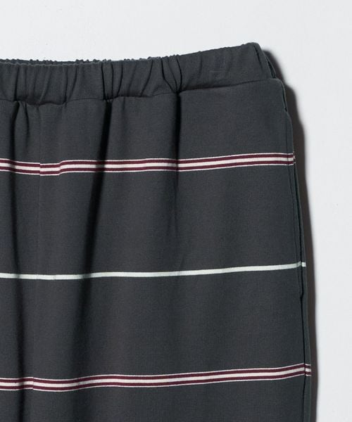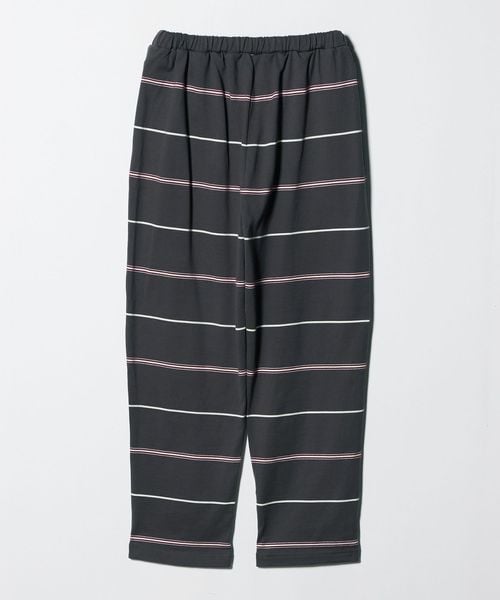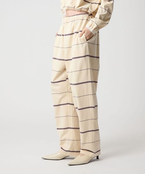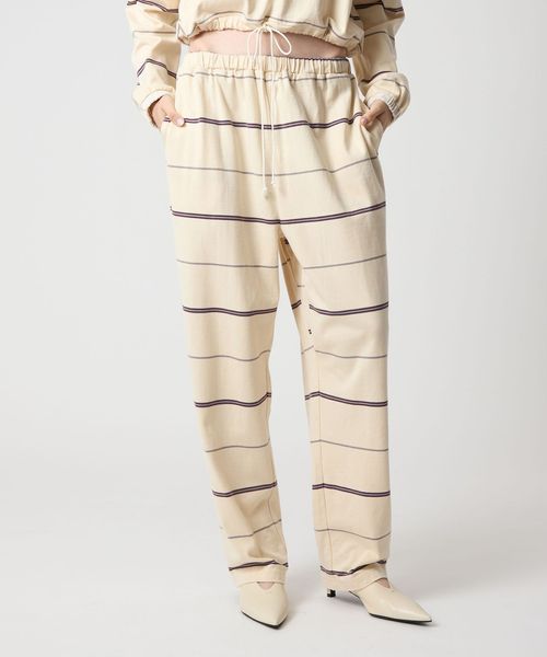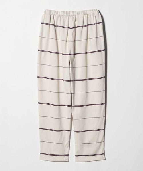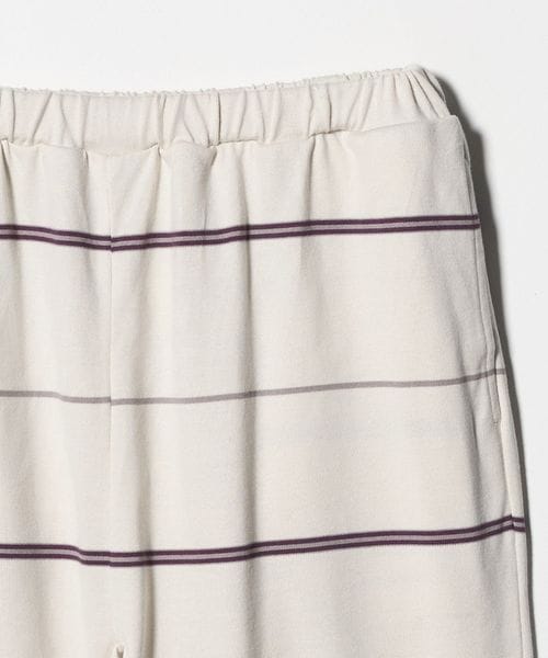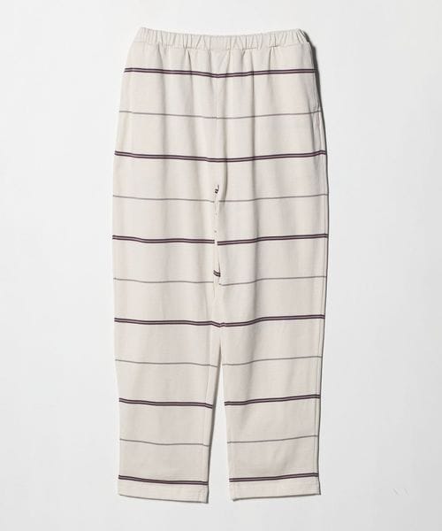 ウエストゴム仕様でスウェットパンツのようなラフなはき心地ながら、太幅ピッチの細いボーダーがカジュアルになりすぎず、大人らしい抜け感を演出。