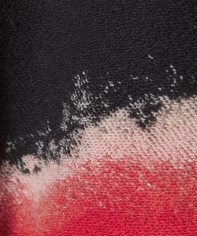 袖からボディに流れるような大胆な染め加工を施し、全体的にツイストされ首元のVガゼットや脇線まで少し捻じれているような遊び心のあるデザインが魅力です。