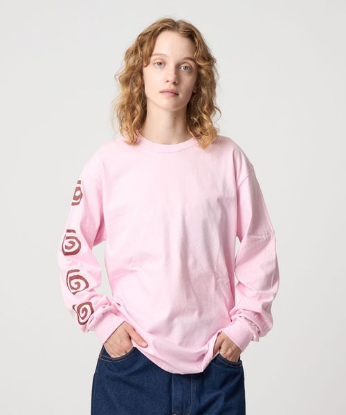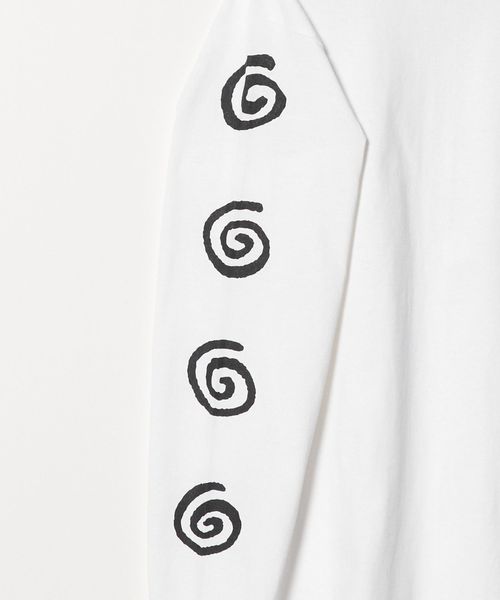 右袖にアンモナイトの化石やワラビのように自然物や動物の生態にもみられる形状の馴染みやすさと相反した非日常感の共存をインスピレーションした「ROKURONICLE(ロクロニクル)」モチーフを配したロングスリーブTシャツ。