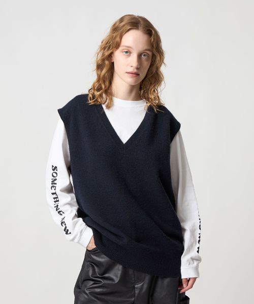 ウールアルパカナイロンブレンドのウォーム感のあるオーバーシルエットVネックニットベスト。