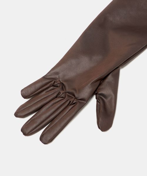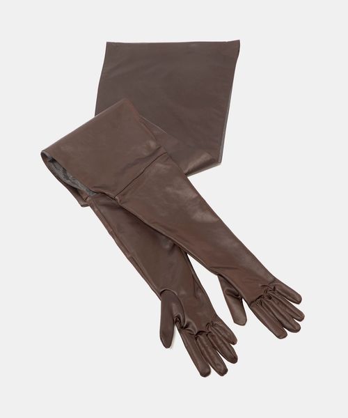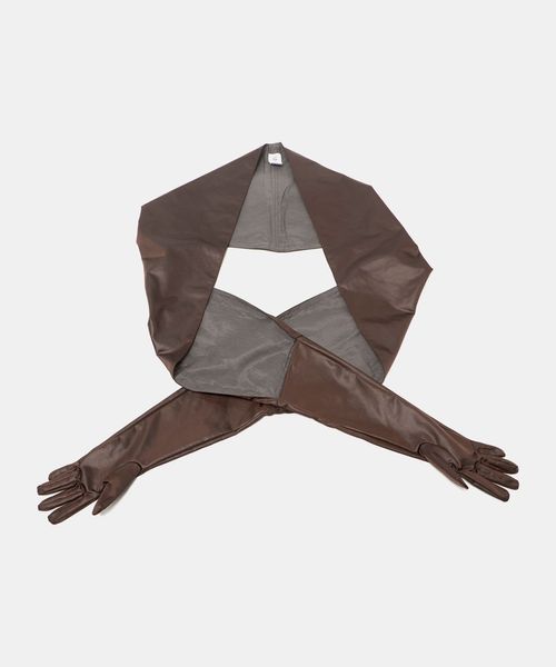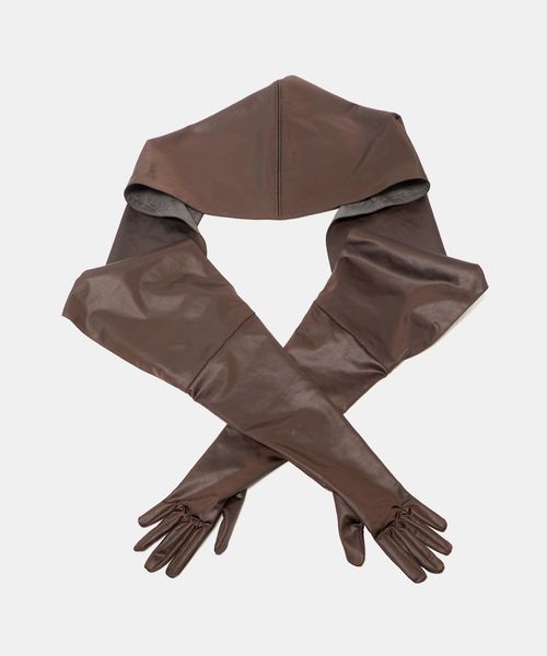 マットながら艶感のあるレザーライクなポリエステル生地を使用したストールの先に手袋がついたストールグローブ。