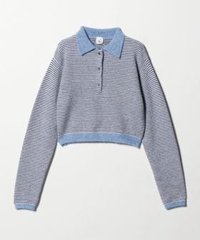 レトロシックな細かいボーダーに襟と裾、袖口は単色で引き締め大人らしく、短めの着丈バランスがモダンとフェミ二ニティな印象を加えます。