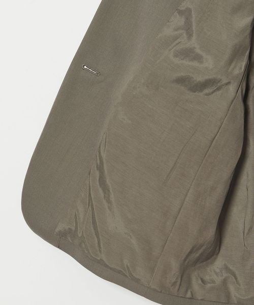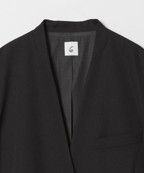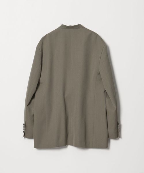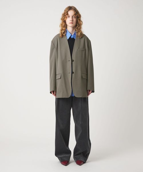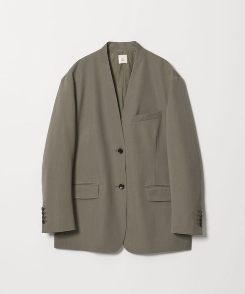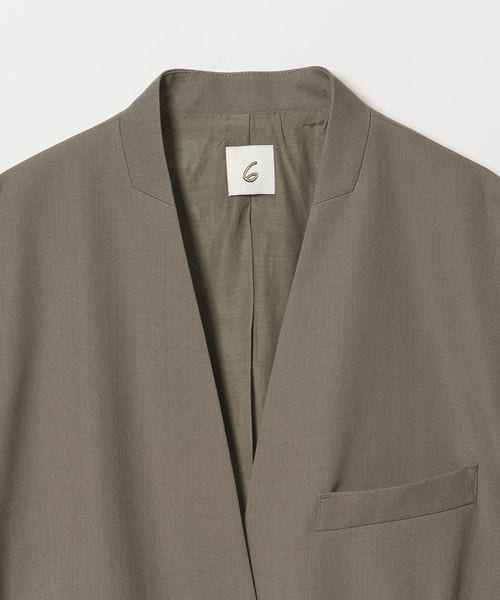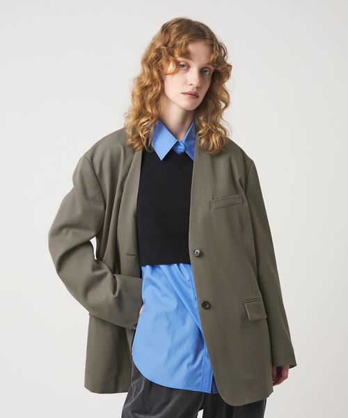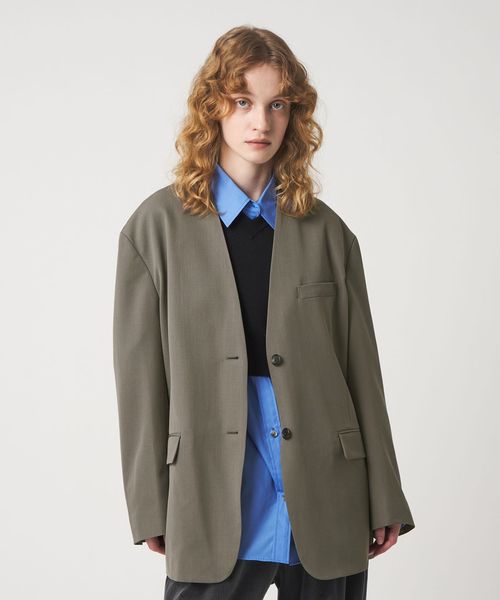 毛織生地で仕立てたマニッシュなノーカラージャケット。