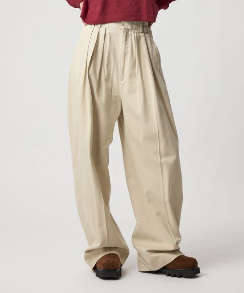 やわらかさにも、独特のコシを出したコットンレーヨン混の生地で仕立てたビッグシルエットのタックパンツ。