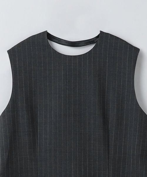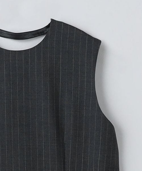 フロントからはネックの詰まったドレッシーなデザイン、バックスタイルはネックとウエストのストラップのみの大きく開いたデザインで前後でのコントラストがユニーク。