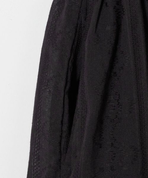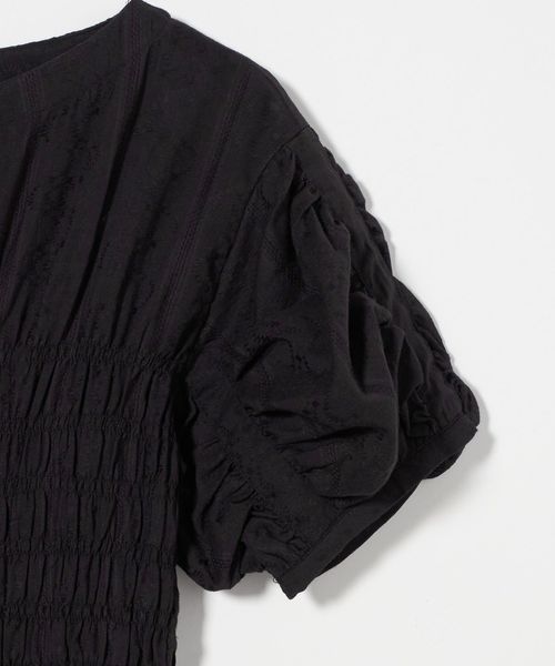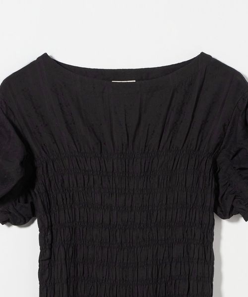 細かな柄が入ったドビーコットン生地を使用したシャーリングドレス。
