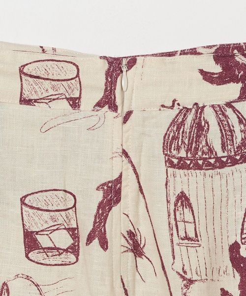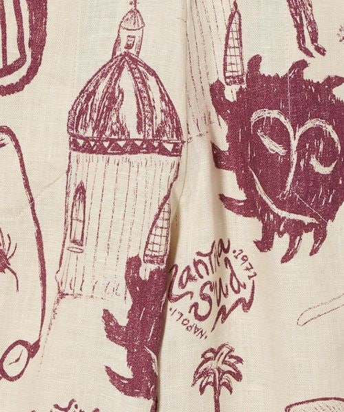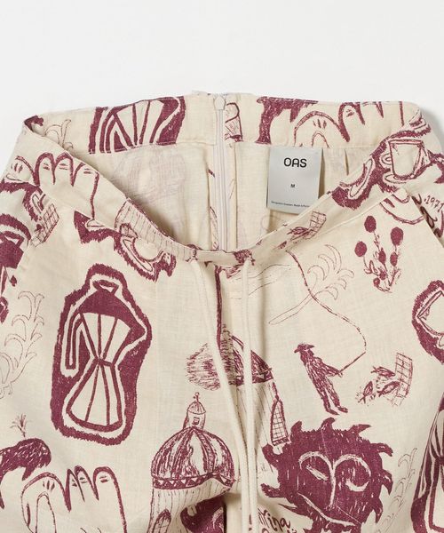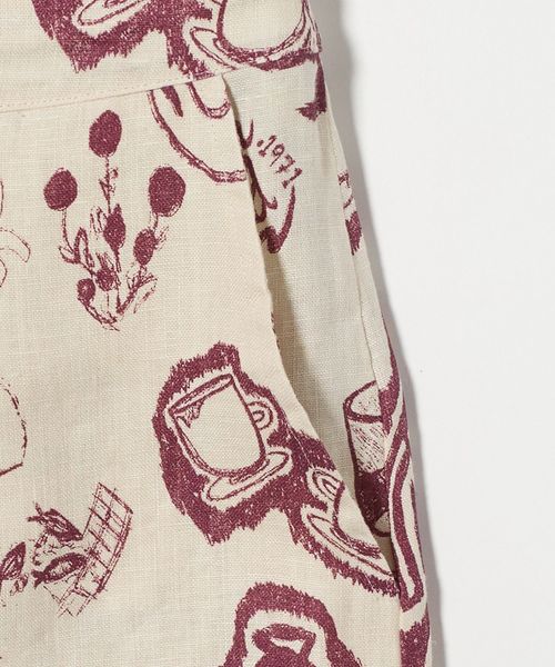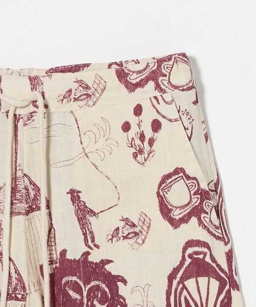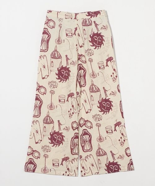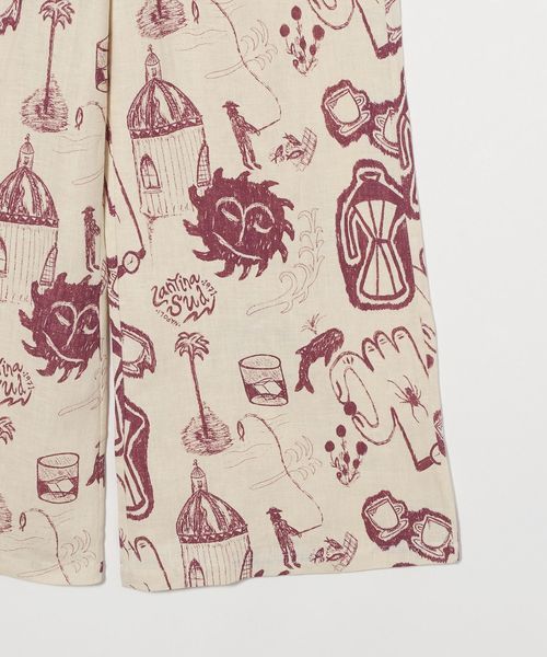 旅の日記の落書きをイメージしコラージュのようにデザインされたプリントがあしらわれたパンツ。