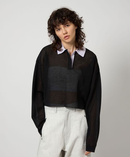 ポリエステル麻混素材のさらりとした風合いのラガーシャツ型ニット。