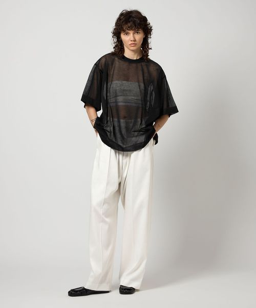 Tシャツライクなカジュアルなアイテムも、インナーが透け、艶感のある着こなしに。