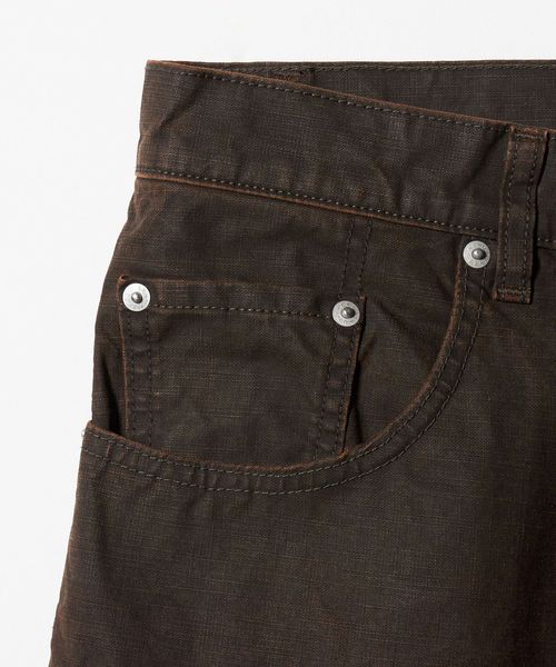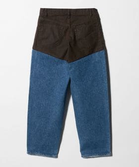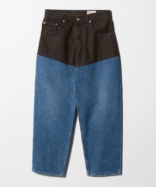 オイルクロスのようなキャンバスとデニム、異なる生地をドッキングしたパンツ。