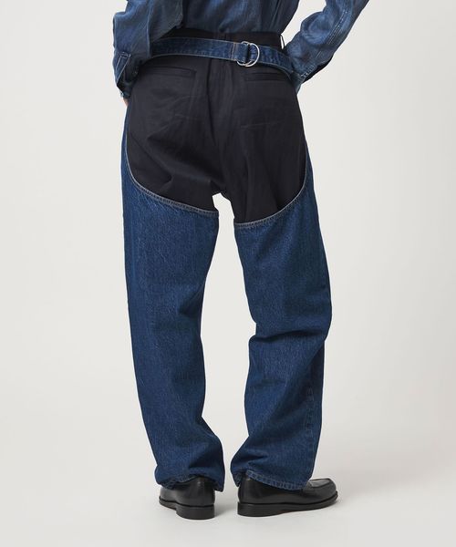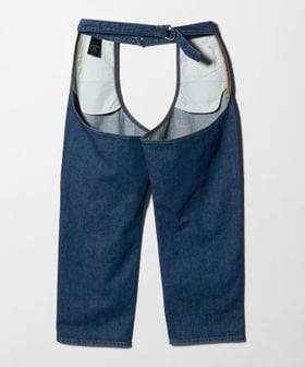 カウボーイがパンツの上から身に着けて脚をカバーするための、股とヒップ部分が開いたオーバーパンツ“CHAPS(チャップス)”から着想した、レイヤードを楽しめるデニムアイテム。