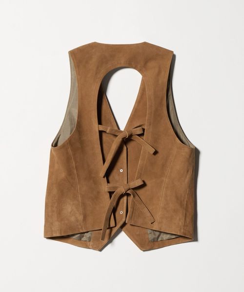 フロントはマニッシュな印象ながら、ミリタリーディテールに着想を得た、開いた背中を紐で結ぶデザインがセンシャルな艶感を演出します。