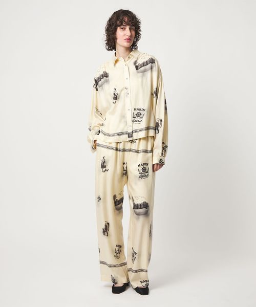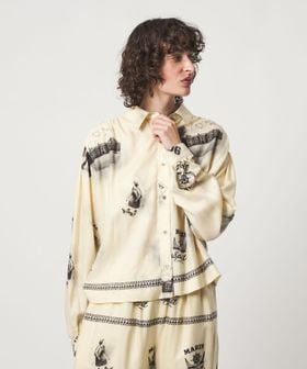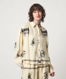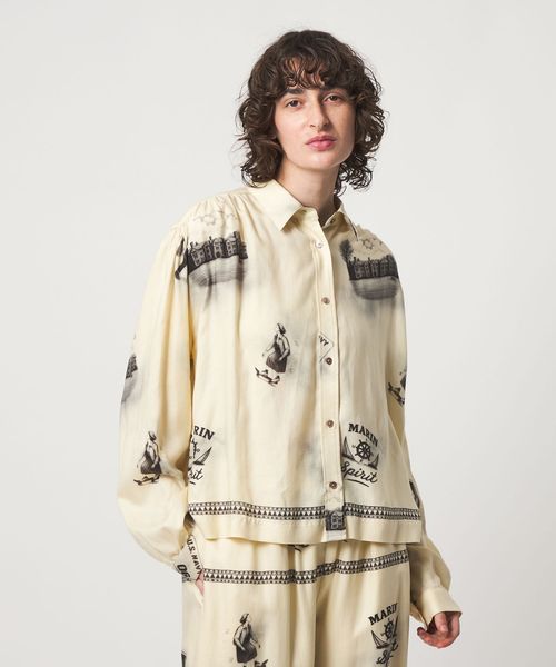 両肩にギャザーを寄せたクラシックでエレガントな印象のシャツに、レトロシックなプリントのバランスが、他にはないスタイルの主役となるデザイン。