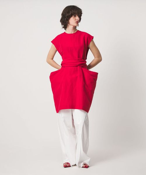 ウエストサイドにボタンひとつで留めている生地部分外して、ひらっとしたラッフルのニュアンスが生まれます。