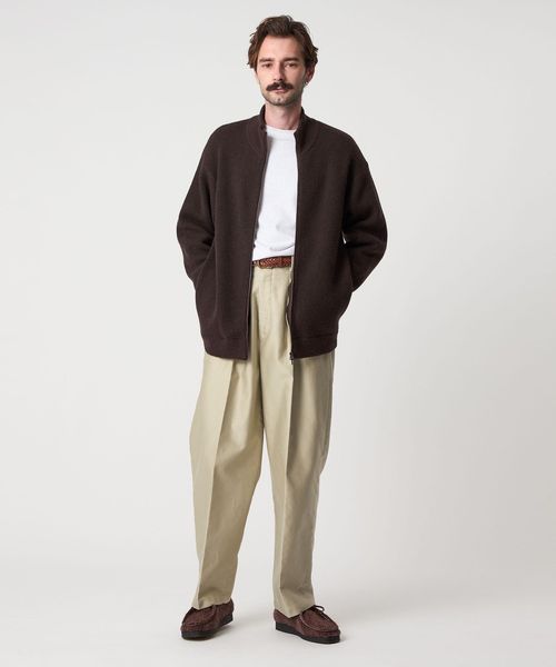 上質なハミルトンラムズウール原料を用いて、ボリュームを抑えたミドルゲージの両畔編みで編み立てています。