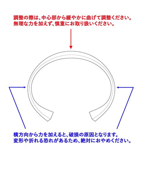 またサイズ調整の際、横から負荷を与えると折れる原因となりますので、サイズ調整の際は真ん中部分を曲げて調整してください。