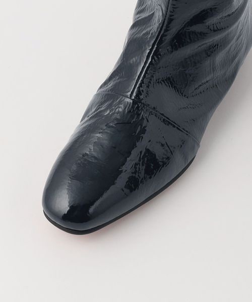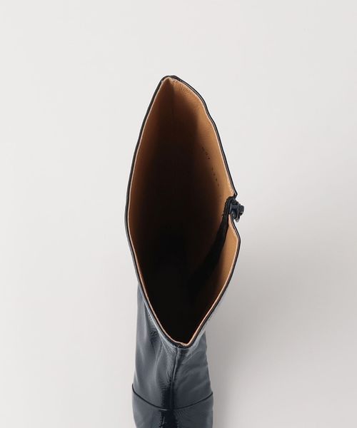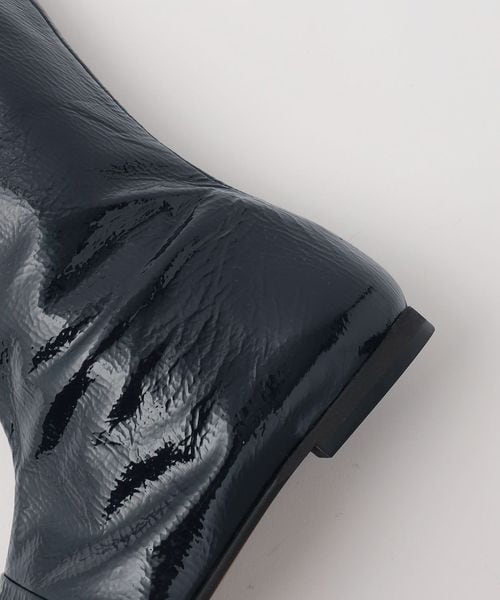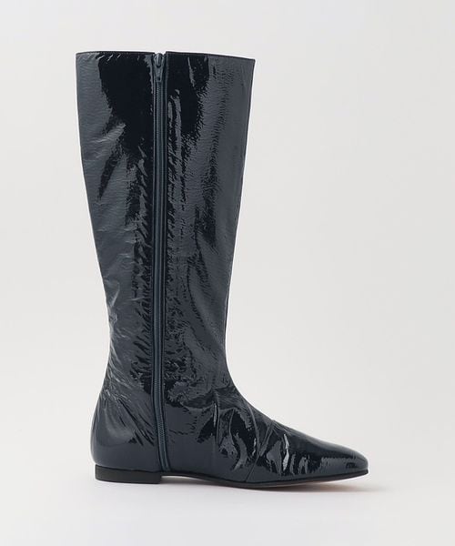 シックなネイビーカラーに、エナメルの光沢がエレガントなロングブーツ。