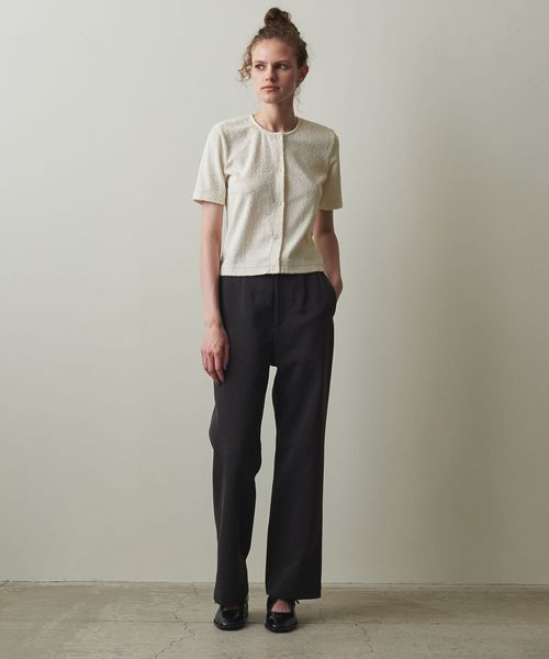 コンパクトなシルエットをいかして、ボリュームのあるボトムスとの合わせがおすすめ。