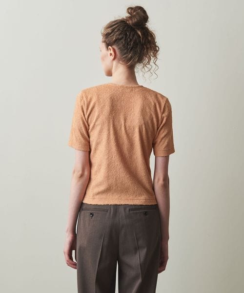 毛足のある素材をいかし、ベーシックなクルーネックデザインに、上品な5分袖とコンパクトなサイズがトレンド感をプラス。