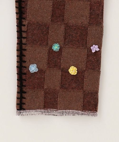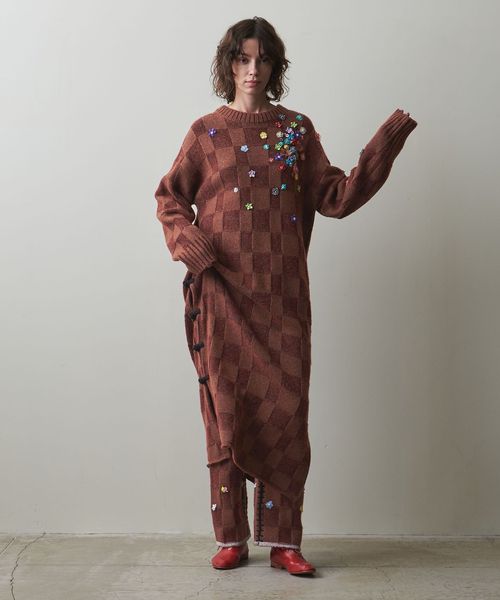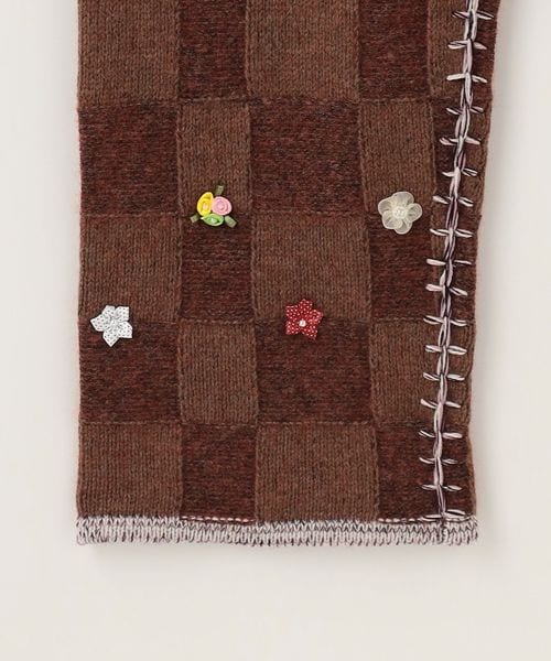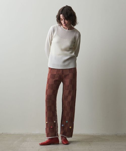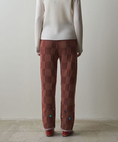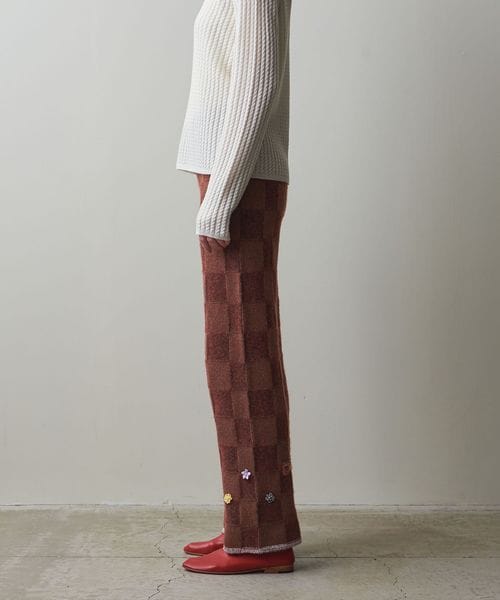 ブロックチェック柄のニットパンツの裾に、フラワーモチーフが添えられたイージーパンツ。