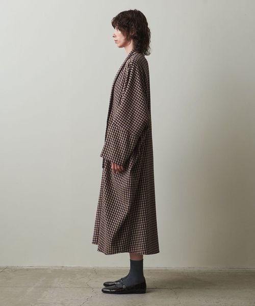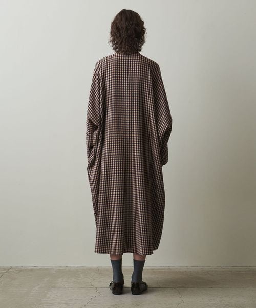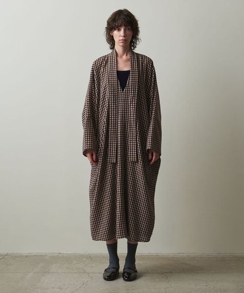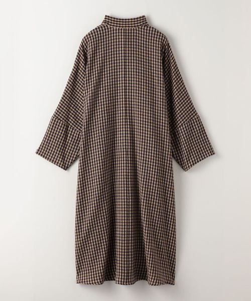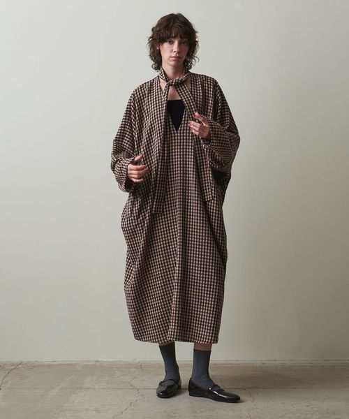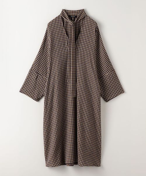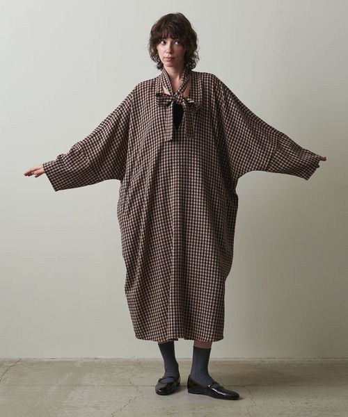 首元についたネックスカーフをアレンジできる、こなれたチェック柄のカフタンドレス。