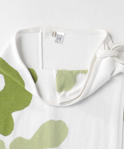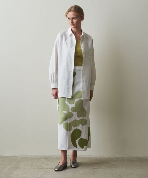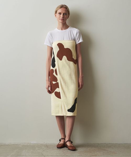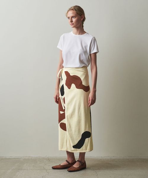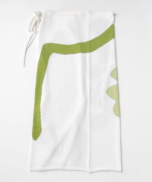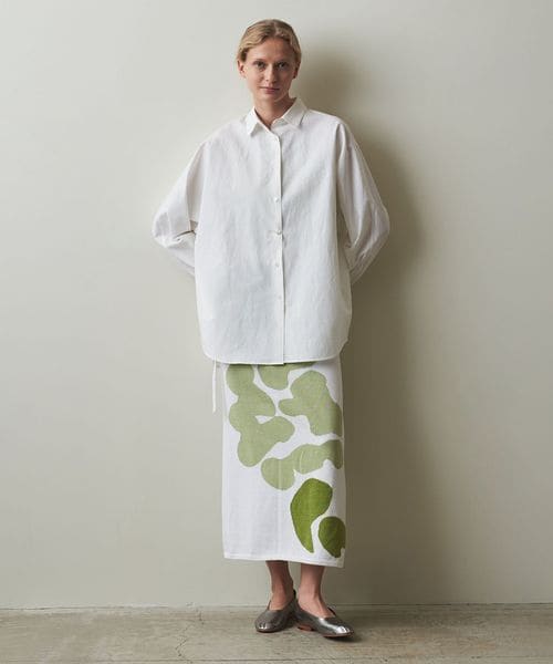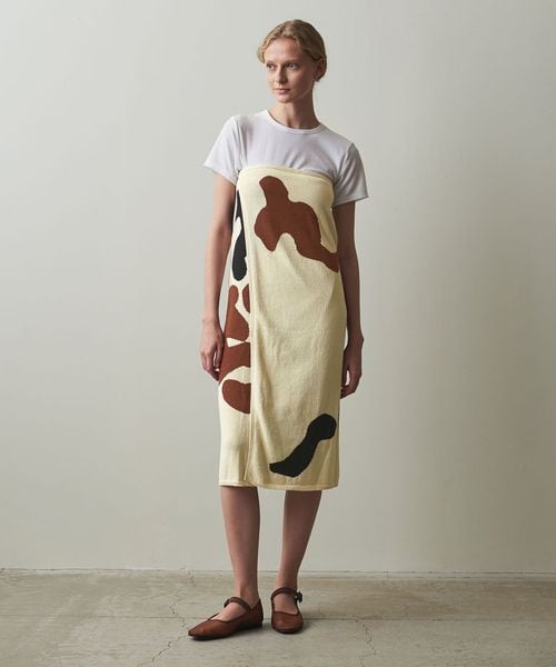 シンプルな巻きスカート型で、巻く位置でスカート丈を変えたり、打ち合いを逆にすることで違う柄を出すこともでき、自由な着方を楽しめる一着です。
