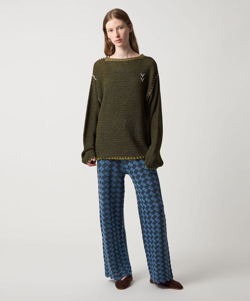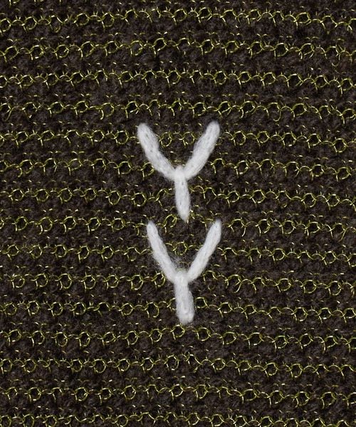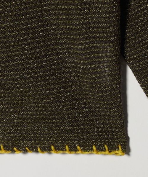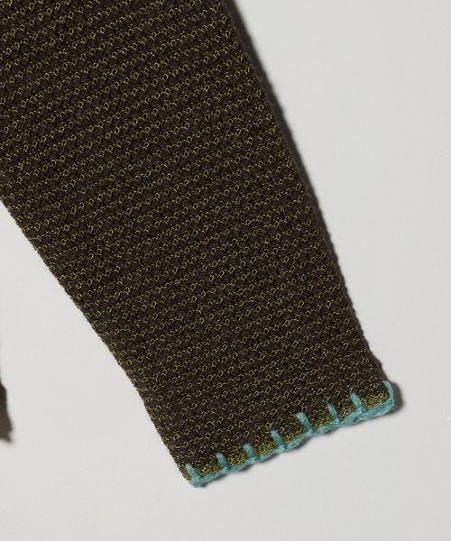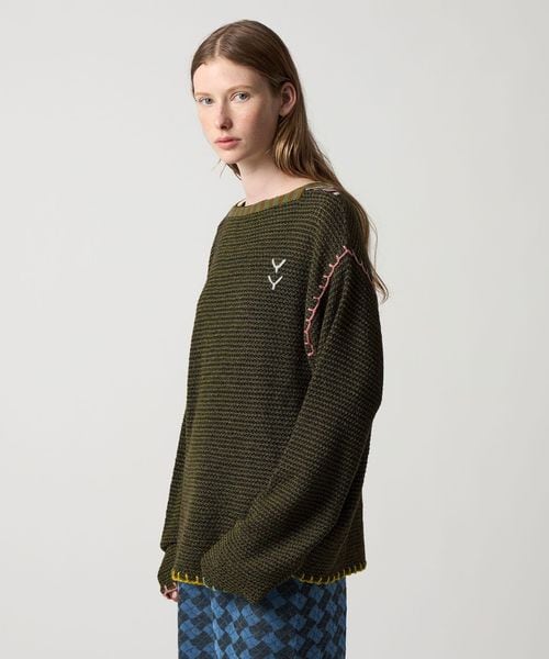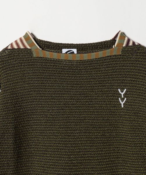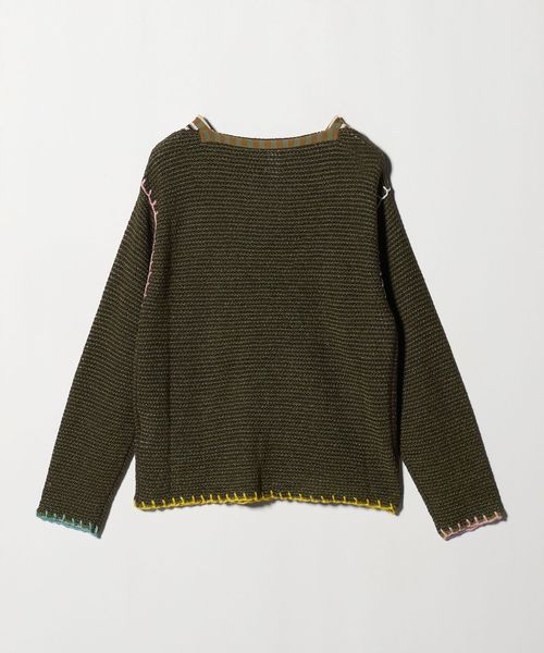 コントラストのある太めのブランケットステッチや、ネックと肩の部分にストライプ柄を配した個性的なデザインが魅力。