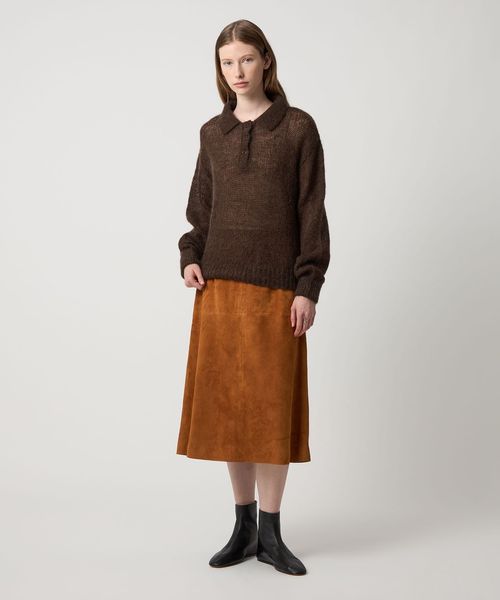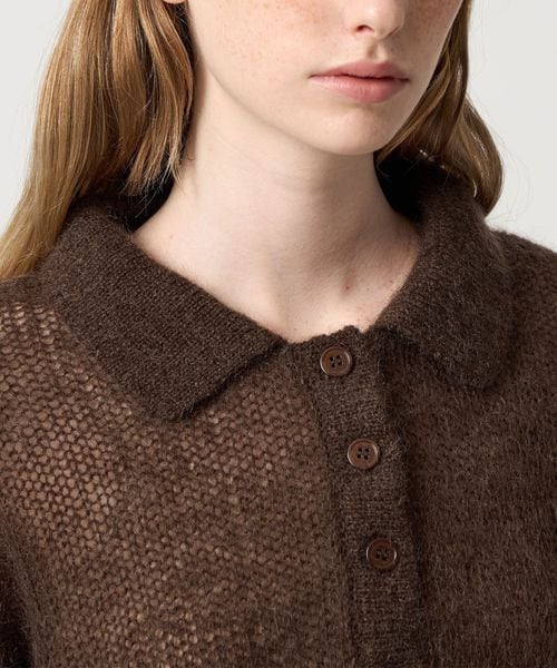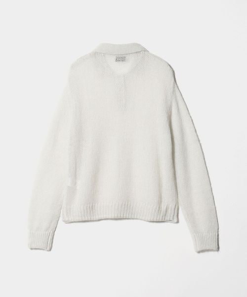 ゆるめに編みたてたシアーな風合いに、上品なポロ型デザインのバランスがこなれた雰囲気を演出するニットは、インナーで印象を変えられるのも魅力。